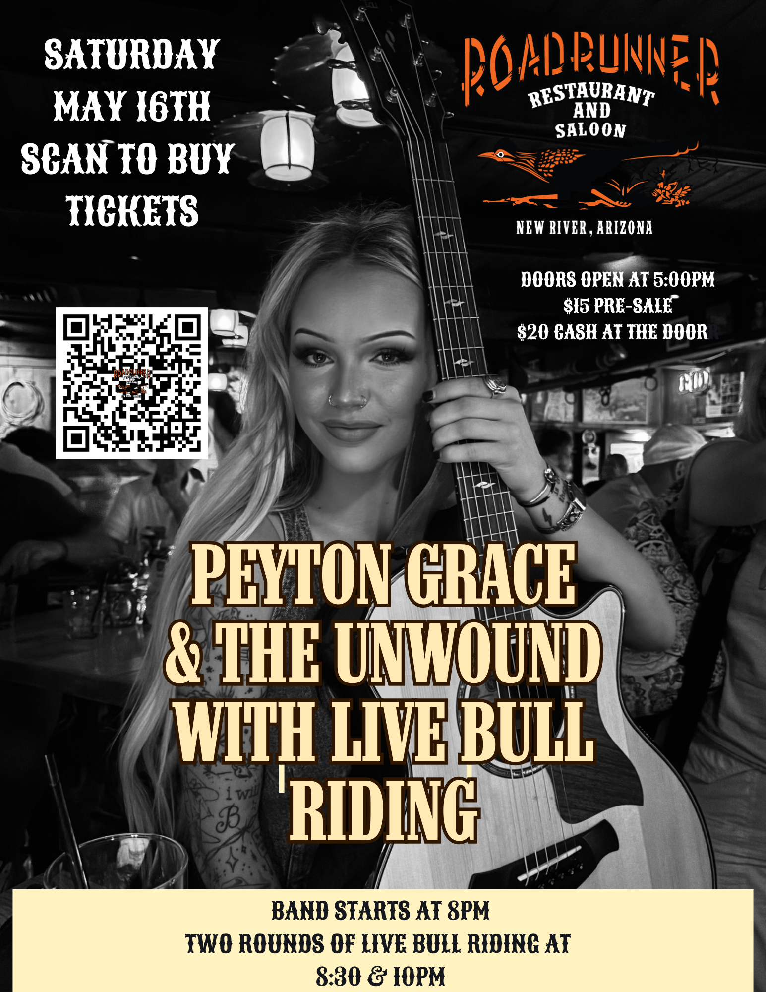 New River's own Peyton Grace & The Unwound return to the Roadrunner Saturday, May 16th with two rounds of Live Bull Riding! Peyton is a local gal who grew up in the heart of New River and has been making her mark on the music world over the last few years! Live music from 8 to midnight with two rounds of live bull riding at 8:30 & 10PM!